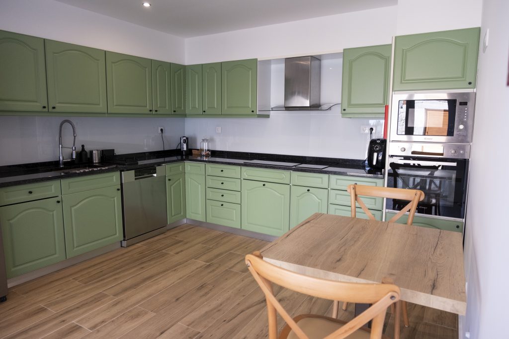 A cozinha, totalmente equipada, convida a momentos simples e partilhados — preparar uma refeição, tomar um café com calma, ou apenas desfrutar do silêncio enquanto o dia começa.
